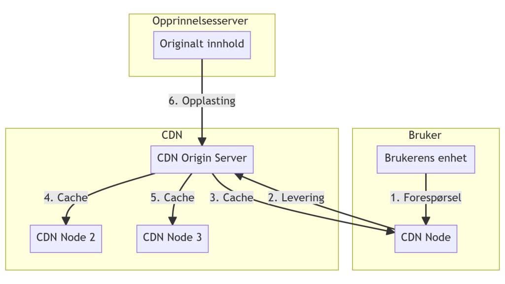 Med en CDN er det ikke bare én server som leverer innholdet til deg. I stedet er det flere servere som er spredt over hele verden. Disse serverne kalles ofte "noder." Når du besøker nettsiden, blir du koblet til den nærmeste noden i ditt geografiske område. Dette reduserer avstanden forespørselen må reise, noe som resulterer i raskere lasting av nettsiden.