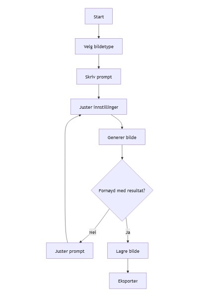 Spørsmål: Hvor lang tid tar det å generere et bilde? Svar: Typisk 30 sekunder til 2 minutter, avhengig av kompleksitet og innstillinger.