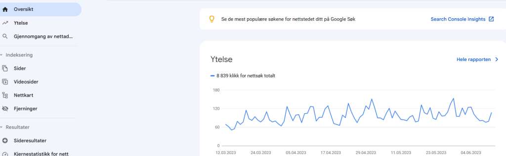 Det gir deg også innsikt i søkeordsrangeringer, klikkfrekvenser og indekseringsfeil. Ved å bruke Google Search Console kan du identifisere mulige problemer med nettstedets ytelse og få innsikt i søkeordene som fører til trafikk på nettstedet ditt.