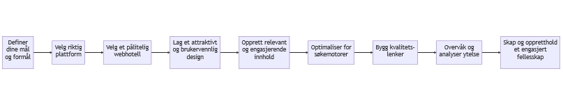 Definer dine mål, velg riktig plattform og webhotell, og fokuser på å lage relevant og engasjerende innhold. Implementer grunnleggende SEO-teknikker, bygg kvalitetslenker og overvåk ytelsen til nettsiden din.