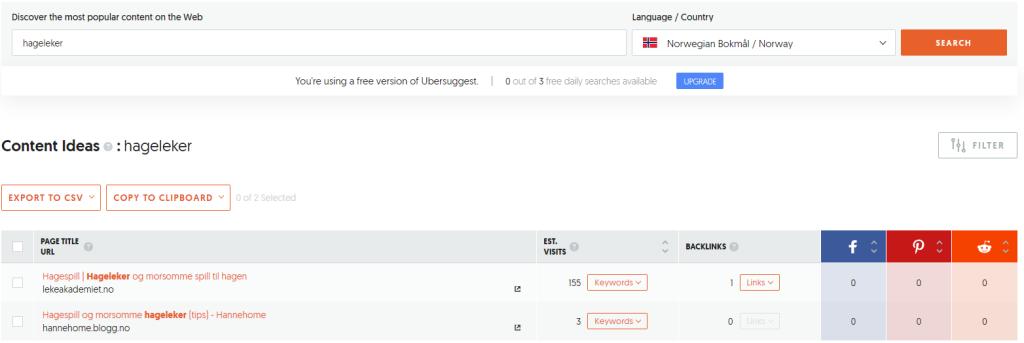 Verktøyet tilbyr også funksjoner for innholdsoppdagelse og idegenerering. Ved å bruke Ubersuggest kan du finne populære innholdsemner og få forslag til hva du skal skrive om.