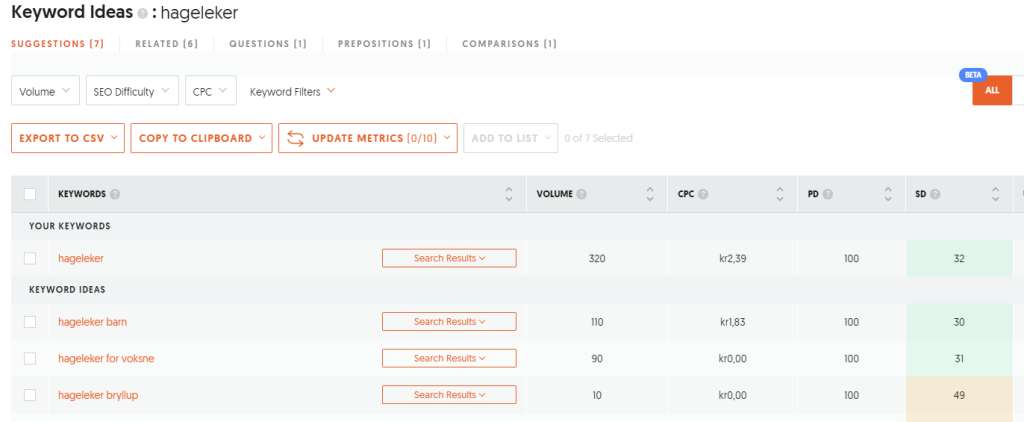 Skriv inn et relevant søkeord eller en frase relatert til din bransje eller ditt innhold, og Ubersuggest vil generere en omfattende liste med relaterte søkeord. Disse ideene kan hjelpe deg med å identifisere potensielle nøkkelord du bør målrette.